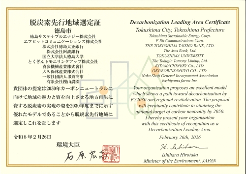 2026年2月26日、環境省により『脱炭素先行地域選定授与式』が開催され、当社代表取締役社長の吉本幸男も徳島市の共同提案者として参加いたしました。授与式では、選定証の授与に続き、国による支援メニューの説明と、選定地域代表による今後の抱負発表が執り行われました。
